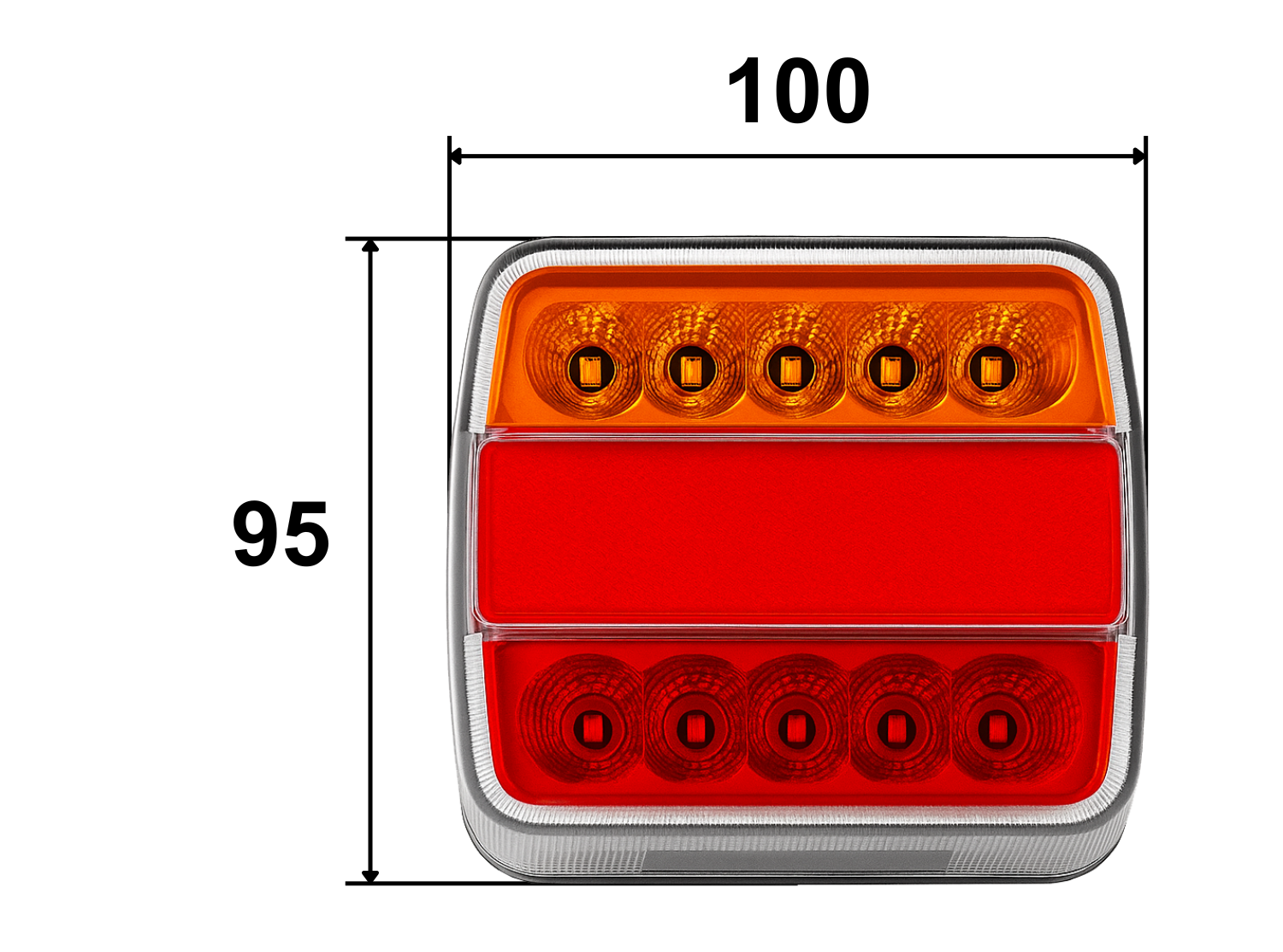 LED luč s štirimi funkcijami: Pozicijska luč, STOP luč, smerokaz, osvetljitev registrske tablice. Odporna na vodo in prah.