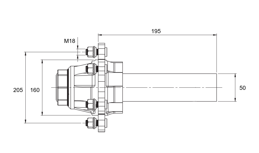 Die ungebremste Achsschenkelwelle ist für den Einsatz an verschiedenen Anhängertypen ohne Bremssystem vorgesehen. Die Länge der Achsschenkelwelle beträgt 195 mm bei einer Tragfähigkeit von bis zu 1700 kg.