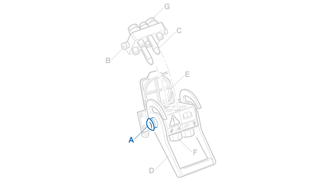 Originalni varnostni gumb za hitre spojke Multi-Faster. Gumb mehansko blokira ročico na fiksnem delu plošče in tako prepreči nenamerno odklopitev hidravličnih vodov med delom ali transportom. Za odklop je gumb treba pritisniti. Ročice nikoli ne silite brez predhodnega pritiska.